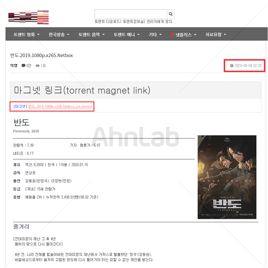 지난 6월 24일 ASEC 분석팀은 현재 상영중인 영화 "결백" 영화 파일을 위장한 백도어 악성코드의 유포 현황을 발견하였다. 그리고 8월 5일 동일 류의 악성코드를 모니터링 중 최신 영화인 "반도" 영화 파일로 새롭게 위장한 백도어 악성코드가 유포되는 정황을 포착하였다. 공격자는 지난 번과 동일하게 일반 사용자들이 많이 이용하는 "토렌트(Torrent)"를 통해 악성코드를 유포하였으며, 업로드 시점은 8월 4일 02시 20분으로 확인되었다. 자사 ASD(AhnLab Smart Defense) 인프라에 따르면 해당 파일에 의한 감염자 수가 빠르게 증가하고 있다.