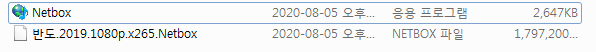 유포지에서 다운로드 된 토렌트 파일명은 영화 파일("반도.2019.1080p.x265.Netbox.zip")인 것처럼 보이지만, 실제 파일의 확장자는 zip 압축 파일이다. 해당 압축 파일 내부에는 아래의 그림과 같이 반도 영화와 무관한 영화 동영상 파일 그리고 악성코드("Netbox.exe") 총 2개의 파일이 존재한다.